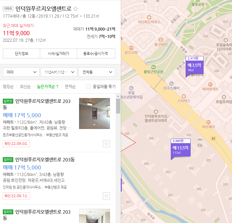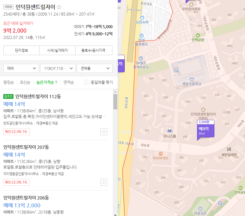 2009년 11월에 입주하였으며, 총 38개 동 2540세대의 대단지입니다. 전용면적 59㎡부터 169㎡로 구성되어있습니다. 연식의 차이가 있지만 타입 및 단지의 규모는 인덕원 자이SK뷰 단지와 비교한 면이 있습니다. 현재 매물은 84㎡ 타입 기준으로 9억 후반에 13억까지 다양합니다. 최근 실거래가는 22년 7월 기준 84㎡ 타입 9억 2천입니다.