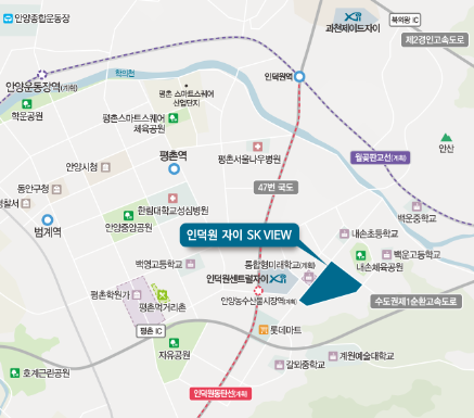 인덕원 자이SK뷰 단지는 의왕시 내손동에 위치하며 4호선 평촌역, 인덕원역, 동탄인덕원선(예정)의 철도망을 갖추고 있습니다. 제1순환고속도로, 제2경인고속도로, 47번 국도 등 단지를 중심으로 교통망도 뛰어납니다. 농수산물 시장, 롯데마트 등의 편의시설과 인접해있으며 16,000세대 규모의 미니 신도시가 될 의왕 내손의 최대 규모 브랜드 단지라고 할 수 있습니다. 또한 평촌 학원가에 가까워서 우수한 교육여건을 가지고 있습니다.
