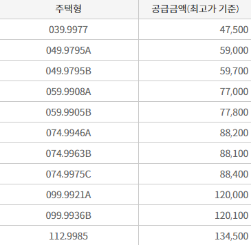 최저가 39㎡ 타입의 4억7천5백만 원부터 최고가 112㎡타입의 13억4천5백만 원까지 형성되어 있습니다. 발코니 확장비는 타입별 3,960,000원부터 12,980,000원까지 상이합니다. 계약금는 20%이며 1차,2차로 나눠서 납부합니다. 1차 계약금 10% 납부, 30일 경과 후 2차 계약금 10% 납부예정입니다.